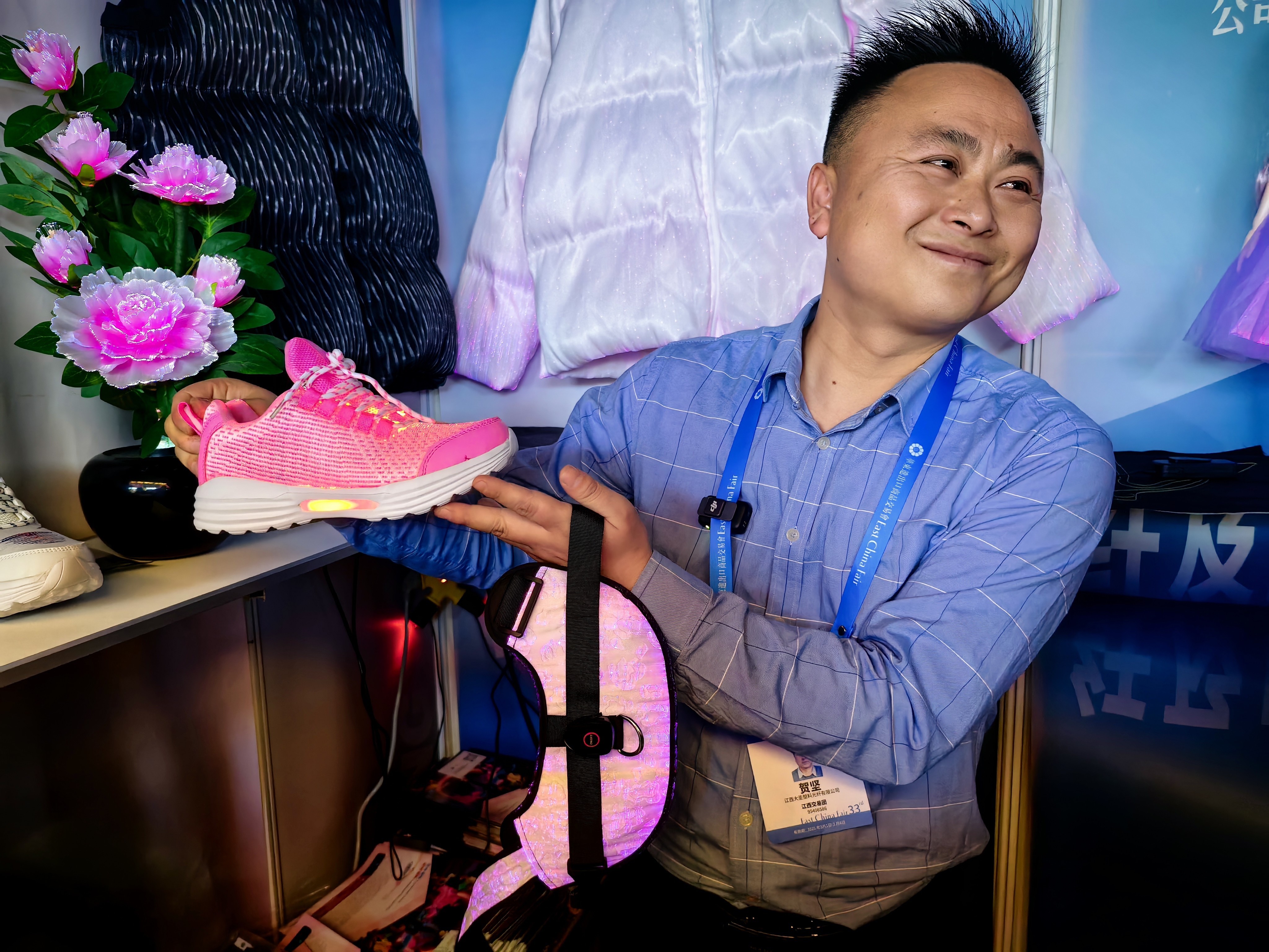 “去年第一次参展华交会就发展了二三十个新客户,今年华交会才开始一早上就迎来了几十组客户的问询。”江西大圣塑料光纤有限公司业务负责人贺坚在展位上忙得不可开交。这一次,企业带来了“会发光”的面料,由塑料光纤与纺织纱线梭织而成,“仿佛穿上了银河”,应用在棒球帽、宠物服装等产品上,让夜间运动更安全。